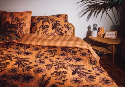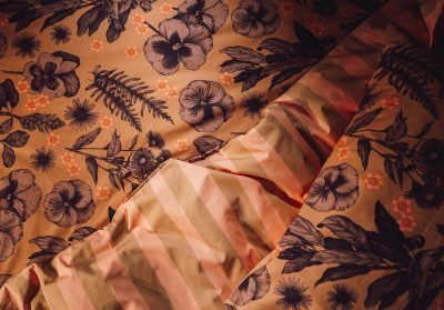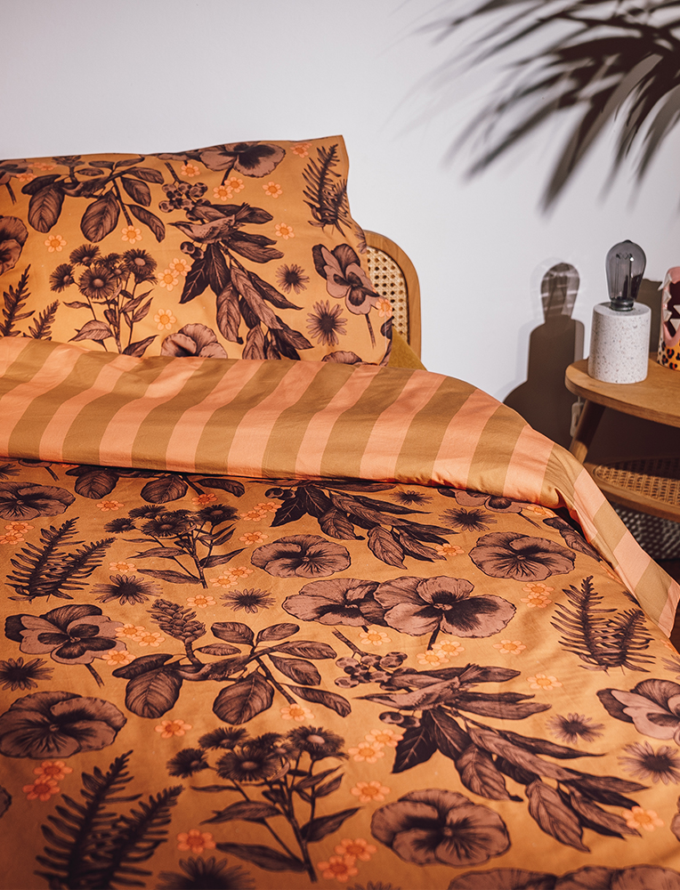 Recto/Verso, motif Colchiques dans les prés sur l’endroit, rayure rose et ocre sur l’envers.